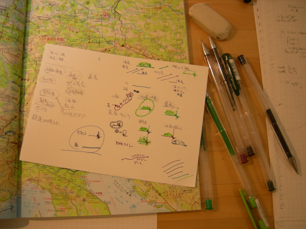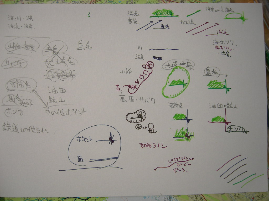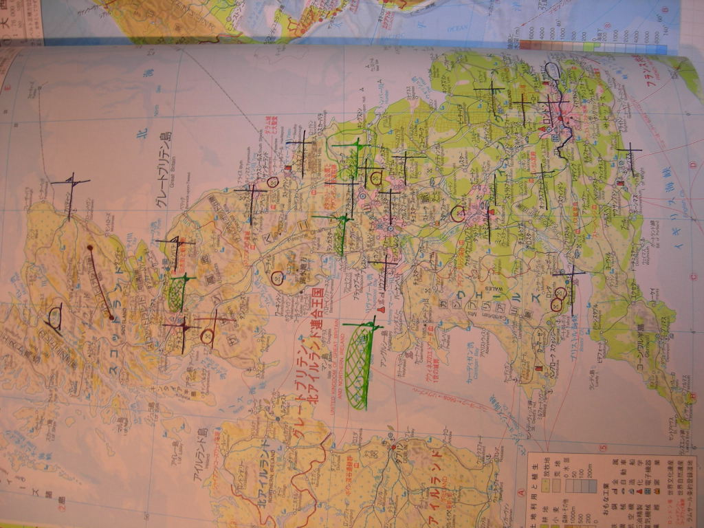 上の写真の通り自分でルール決めて、マークですよ。(このマーク、通称墓標と言いますw。縦横ひっくり返すと、お墓に見える。)私の線は十字です。横にただ引くだけだと見にくいんですよ。縦棒も引いて、強調する感じがよいですよ。縦棒の長さを長くすれば、ちっちゃいけど重要な地名を目立たせることが出来ます。それから、マイナーな国が何かの統計で上位を占める場合、それも書き込んでしまいましょ。地図見れば其処の国が何が盛んか一目でわかるようになります。あと大切なことは・・・古期造山帯と新期造山帯の区別は明確につくようにしておきましょうね。