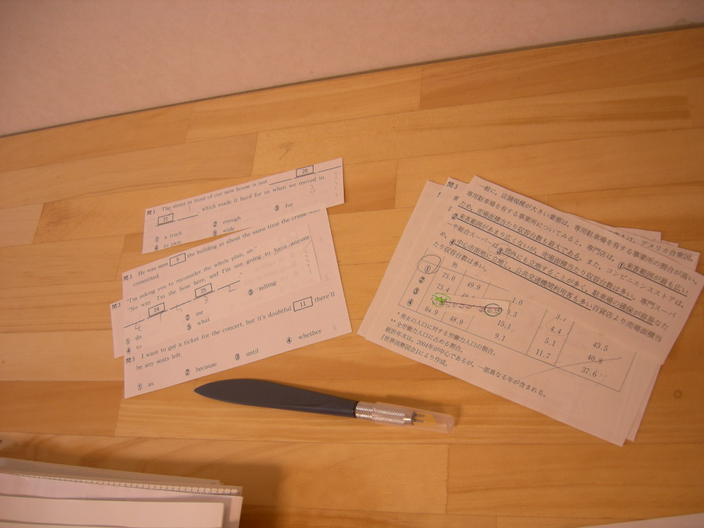 模試や、過去問。模試の過去問ありますね。それをやってください。そして、間違った問題・感でやった問題を切り取ります。私はこんな道具をつかってるんですが・・・